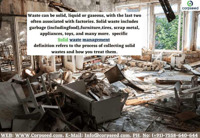 Waste can be solid, liquid or gaseous, with the last two often associated with factories. Solid waste includes garbage (including food), furniture, tires, scrap metal, appliances, toys, and many more. A specific solid waste management definition refers to the process of collecting solid wastes and how you treat them.